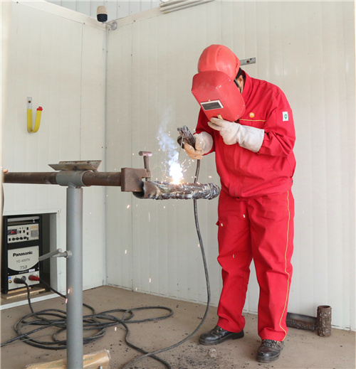 5月20日,在冀东油田四场培训基地电焊操作间内,焊花飞舞、弧光闪现,南堡作业区采油岗员工们透过电焊面罩的镜片正在专心致志地进行焊接工艺,这是他们参加该培训班的最后一天,用成品检验他们的学习效果。