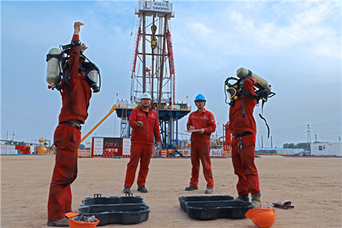 练兵台搭建起来后,班组人员尤其新员工每天利用生产间隙进行实操。生产骨干也使出浑身解数,展开“传帮带”。练兵台成为职工调节工作、活跃气氛、比拼本领的主阵地。图为5月18日,该公司70228钻井队员工在文13储7井井场“练兵台”练习佩戴正压式呼吸器。(蒋晨峰 胡玉杰)