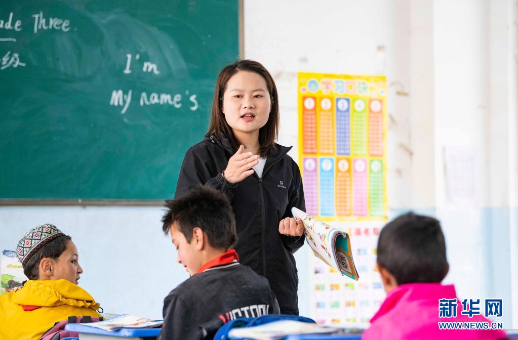 在阿勒玛勒克村小学,陈芳莹为三年级学生教英语课(5月12日摄)。新华社记者 胡虎虎 摄