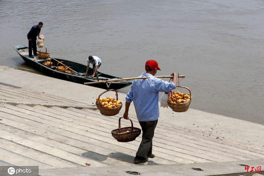 2021年5月24日,在安徽省黄山市歙县,果农正在挑运“三潭枇杷”。(施亚磊/IC photo)