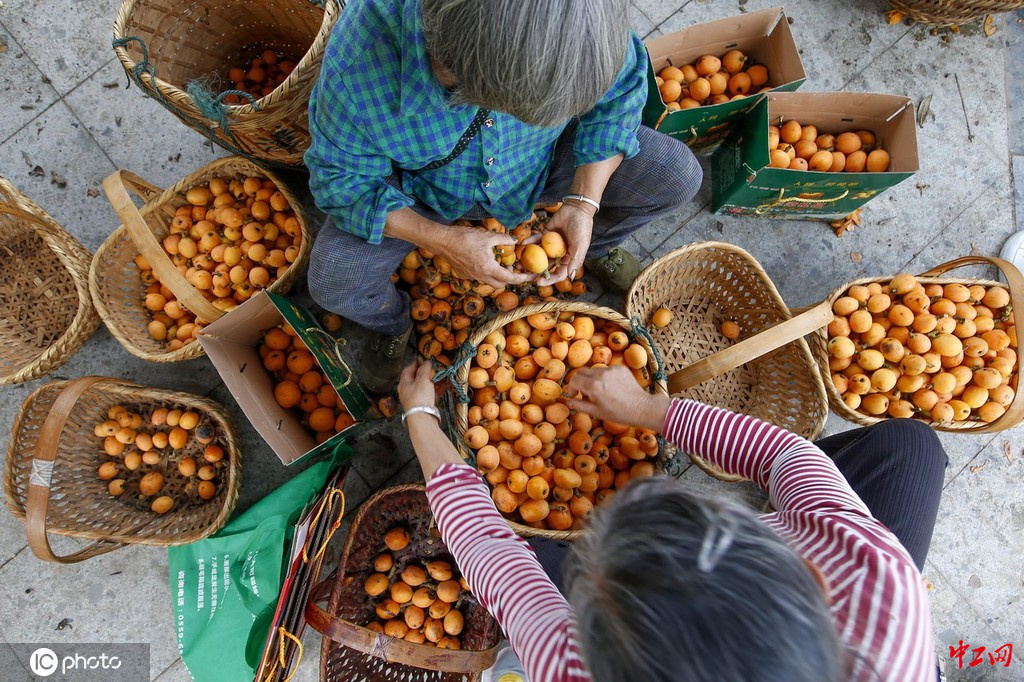 2021年5月24日,在安徽省黄山市歙县,果农正在分拣“三潭枇杷”。(施亚磊/IC photo)