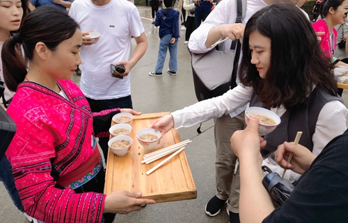 如今,穿着民族服饰的阿婆阿姐在伞下售卖着亲手制作的土特产,鲜香爽辣的湘味菜馆里服务员忙转不停。独特的地理条件造就了恬静优美的自然风光,打通山路后来这里参观游玩的游客络绎不绝。“旅游让我们的钱袋子鼓起来了,房间可以说是一到节假日就一床难求”,隆慧说。