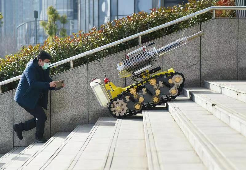 △2020年2月22日,面对疫情防控的严峻形势需求,由中信重工机械股份有限公司研发生产的国内首台可自由回转防疫喷雾消毒机器人,在洛阳市民之家上岗,顺利完成首次防疫消毒任务,助力科技战“疫”。(黄政伟摄 新华社记者张浩然通联)