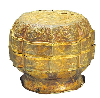 鎏金双凤纹带盖银盒是这批文物中的珍品。银盒通体鎏金,盖面高高隆起,似一朵覆盖的莲花。盖面锤刻花纹以衔草翱翔的双凤为主体,周围环绕8对飞雁,并间以缠枝莲纹和鱼子纹。盖口沿和盒身上腹部均刻有8对奔鹿,下腹部錾刻8朵牡丹团花。高圈足一周刻10只大雁,足边缘刻变体莲瓣纹带。