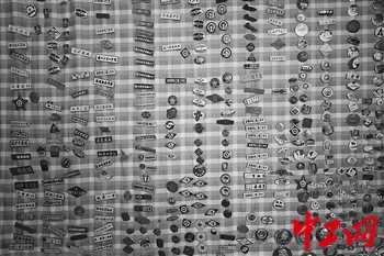 张景振收集的厂徽、帽徽和技校校徽挂满了一面墙。工人日报—中工网记者 王伟伟 摄
