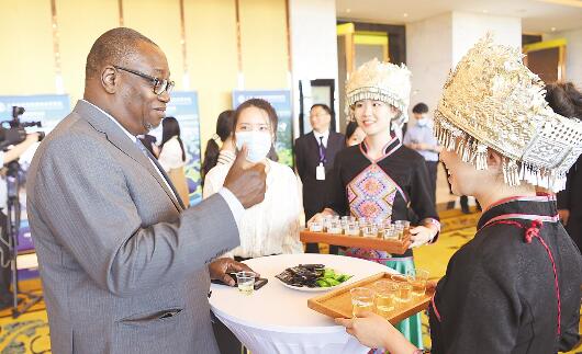 布基纳法索驻华大使阿达马·孔波雷品尝恩施玉露后竖起大拇指。 (湖北日报全媒记者 李溪 摄)
