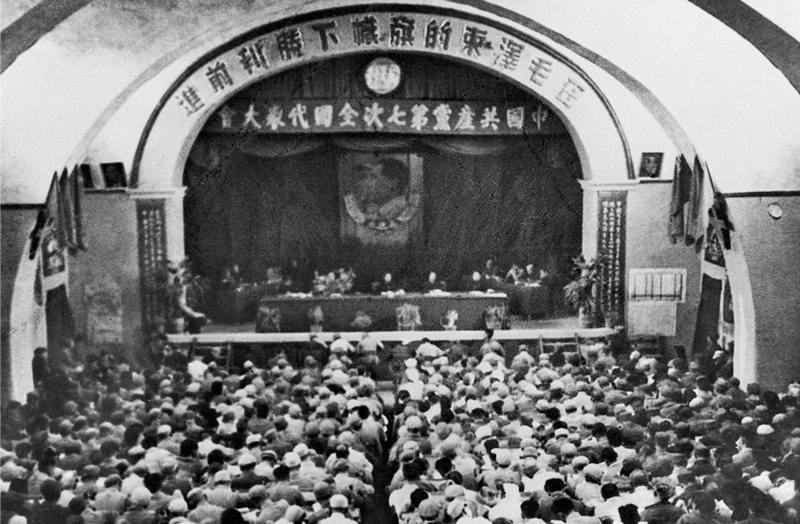 1945年4月23日至6月11日,中国共产党第七次全国代表大会在延安召开。党的七大的一个重要历史贡献是将毛泽东思想确立为全党的指导思想,使全党达到了空前的团结和统一,为夺取抗战胜利和全国解放奠定了强大思想政治基础。图为中国共产党七大会场。 新华社发(资料照片)