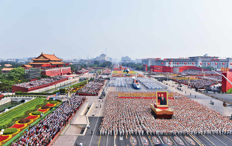 党的十八大以来,我们党之所以能战胜一系列风险挑战,推动党和国家事业取得历史性成就、发生历史性变革,根本在于全党紧密团结在以习近平同志为核心的党中央周围,坚决维护习近平总书记党中央的核心、全党的核心地位,坚决维护党中央权威和集中统一领导。图为2019年10月1日,在庆祝中华人民共和国成立70周年大会上的“伟大复兴”方阵。 新华社记者 徐昱/摄