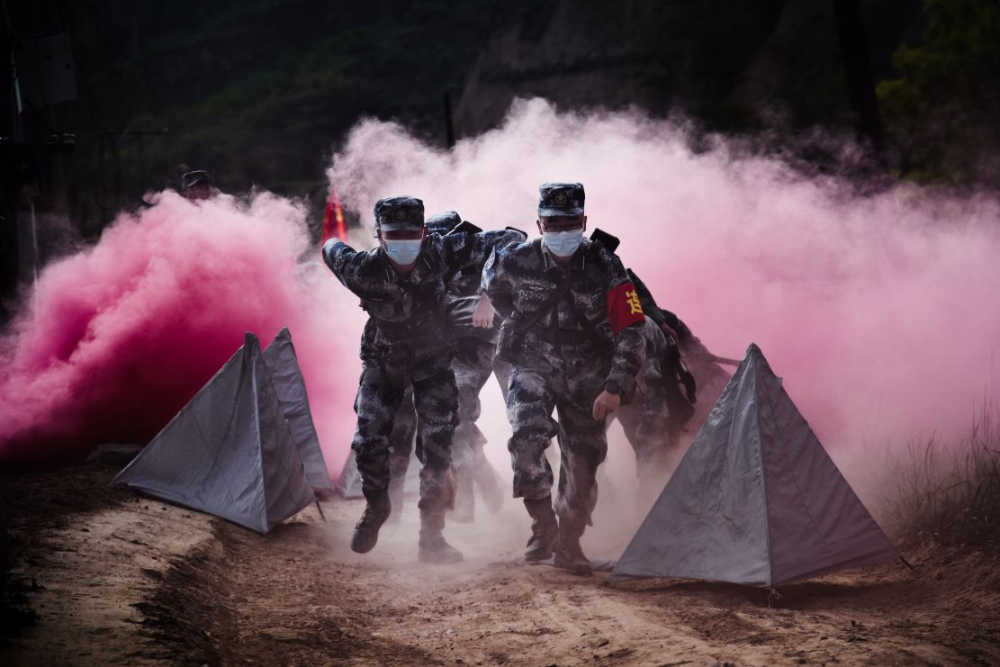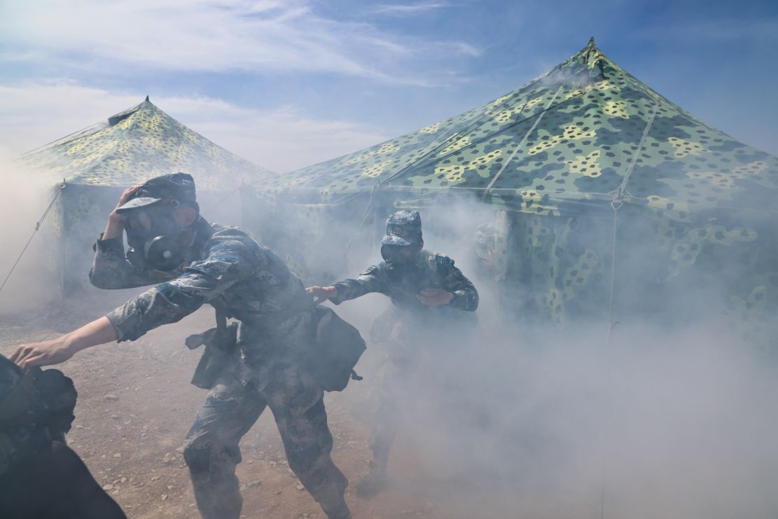 “敌情”刚过,对讲机传来“前方有毒气”的消息,该旅某营营长李勇一边报告情况,迅速组织部队佩戴防毒面具,以急行军的方式通过染毒区。