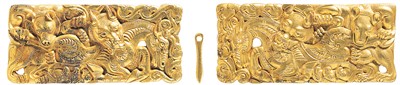 金扣腰带是北方草原游牧民族常用的带具,由于其华贵精美,为汉代贵族所推崇。狮子山楚王墓出土金带扣是目前所见汉代最华美、系结方式最先进的带扣,虽然纹饰主题是草原猛兽搏斗,但从铸造工艺、系结方式来看,应为中原制品。