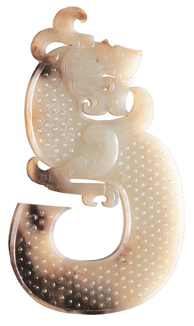除了玉衣,狮子山还出土了多种精美玉器,有玉戈、玉璧、玉佩、玉璜、玉卮、玉杯、玉带钩等,体现了汉代高超的制玉工艺。展柜里一件龙形玉佩颇为吸睛。它以和田玉雕琢而成,莹润光洁。龙蜷曲呈S形,张须露齿,双目圆睁,鬣毛向两边卷曲,颈部以阴线刻出一圈绞丝纹,前肢曲折,龙尾上卷并平削,通体饰勾连涡纹。这件玉龙继承了战国玉龙的雕琢风格,与安徽长丰杨公战国晚期墓葬中出土的玉龙风格非常接近,类似的玉龙还在广州南越王墓中有发现。这种S形玉龙多见于西汉早期王侯墓,这一时期的玉龙着重表现龙的力量和气势,不同于西汉中期以后突出表现龙的温顺、静谧的艺术风格。