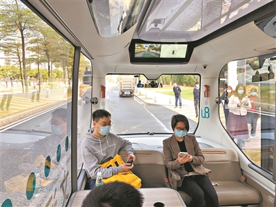 测试是在广州生物岛进行,测试全程约6公里。记者留意到,车辆采用专门设计,造型酷炫。在车前、车后和顶部,可以看到各种摄像头、雷达和传感器。进入车厢内,驾驶席是没有的,更不用说驾驶员了;方向盘是没有的,更不用说电门油门或者刹车了。穿梭巴士行驶于固定线路上,在固定站点集客,用于短途载客。