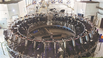新疆天润乳业股份有限公司丝路云端牧场智能转盘式挤奶厅。新华社记者 丁磊 摄