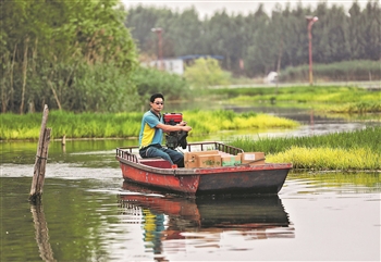 在山东省济宁市微山县南阳镇,邮递员王少朋驾船穿梭在湖面上投送快递。南阳镇位于微山湖北端的南阳湖中,镇里34个行政村的老百姓分散在湖中83个自然岛屿上,特殊的地理位置导致交通出行不便,水上邮路成为唯一的投递方式。