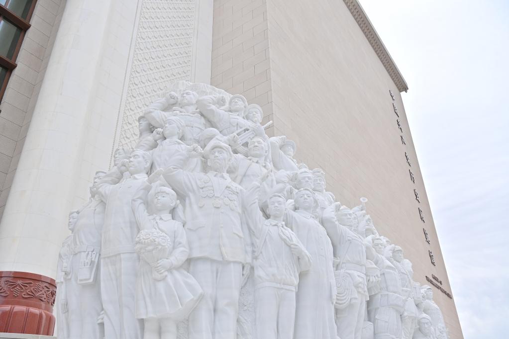 细节一:73位人物形象团结一致。雕塑以“团块结构”作为主体造型语言,73位人物形象融入主体之中,形成团结一致、阔步前行的恢宏阵势,塑造了农民、工人、新经济工作者、党政干部、知识分子和军人形象,各民族的人物形象将生活场景、民族风情进行了诗意化的表现。