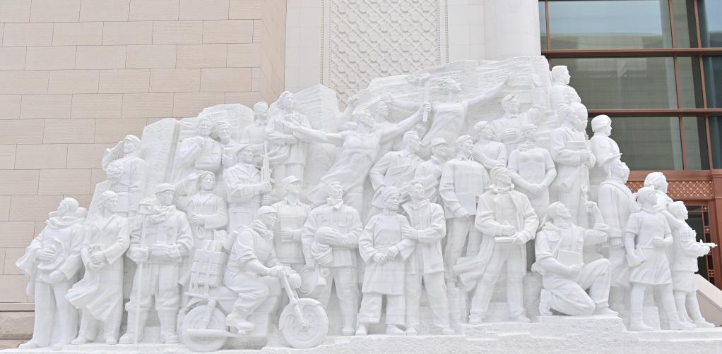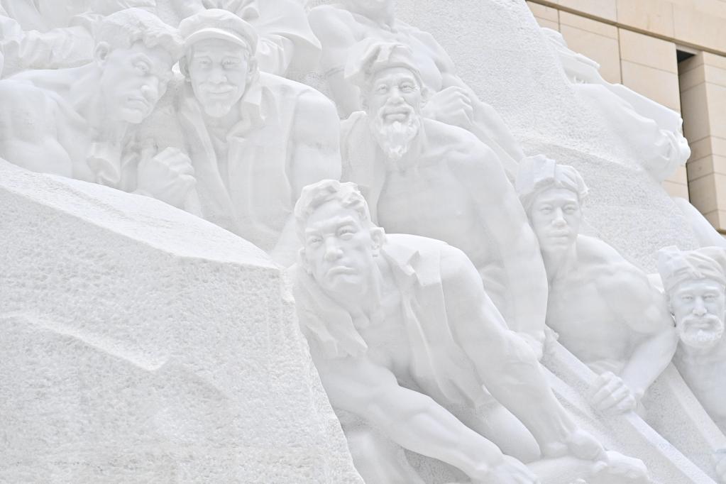 细节一:人物场景揭示新时代成就。雕塑前端正面人物形象是党员干部、大国工匠、农民、军人代表、知识分子、企业家和宇航员等。整个雕塑共塑造人物65位,涵盖不同群体、不同职业,大学生村官、援外维和、建设绿水青山等凸显新时代成就。