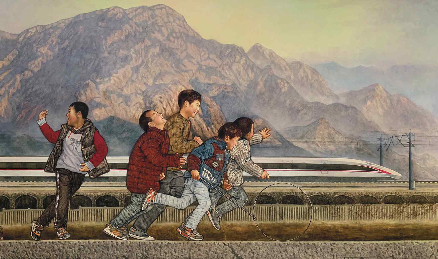 ▲ 高铁进山啦(国画) 210×360厘米 2019年 蔡超 边涛 李鸿莉 国家主题性美术创作项目