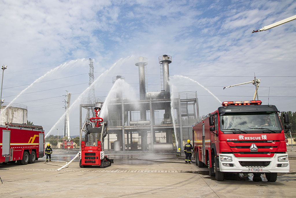 活动现场,启动无人机对现场进行全面勘察,利用机器人、移动炮、高喷炮等大流量设备进行火势控制和装置冷却,多灾种救援场面扣人心弦。