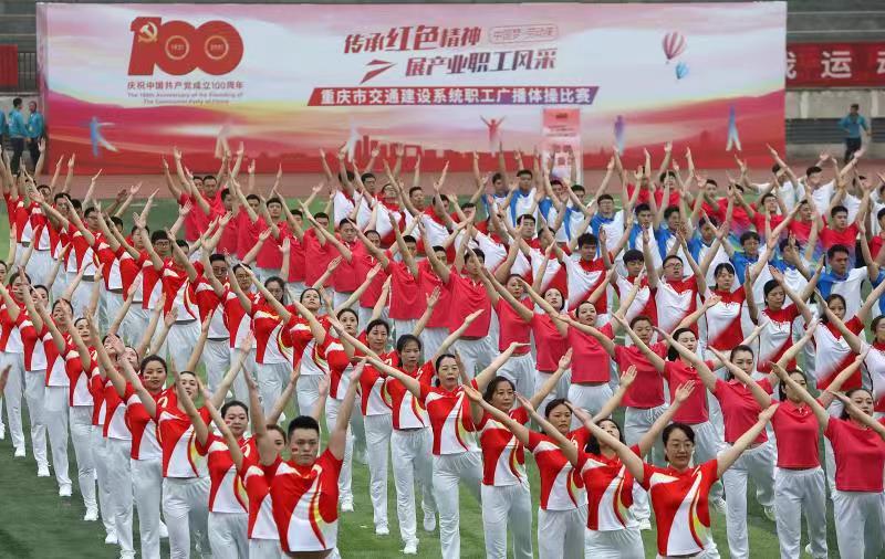 正认真做着广播体操的“运动员”是来自重庆市交通建设系统的职工。重庆市交通建设工会委员会主席杜晓南介绍,为庆祝中国共产党建党一百周年,充分展现重庆交通建设系统职工良好的精神风貌,举办了本次广播体操比赛。