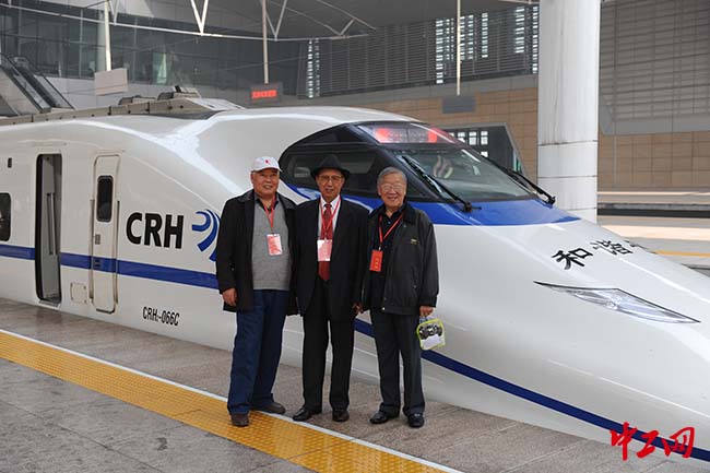 郑传仓(中)和老同事一起与和谐号动车组合影