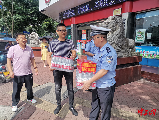 中工网讯 6月27日,正在湖南省安乡县步行街与五总街十字路口开展“一盔一带”安全守护行动和“清伞拆棚”整治行动的十多名安乡交警大队民辅警,收到了由安乡县总工会“清凉一夏·关爱同行”爱心慰问组送来的夏季降温防暑清凉礼包。