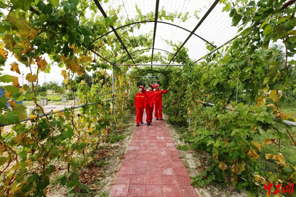 高温来袭,员工们站在柳树旁,借着树荫乘凉,随手摘一颗黄瓜,享受着避暑胜地带来的清凉。(魏冀春、王明珠)