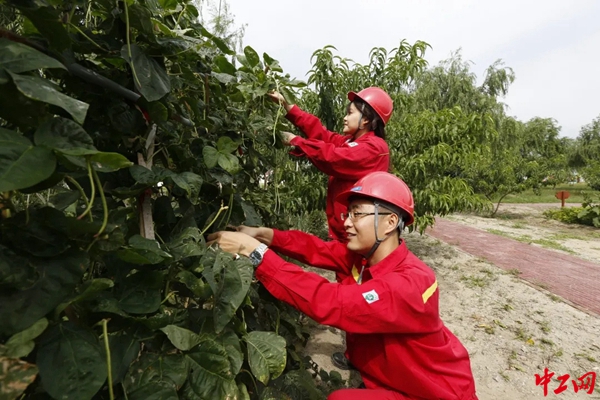 2号人工岛地处渤海湾,四面环海,由海砂吹填而成。员工们利用工作之余,自主采购并种植各种树苗和蔬菜500余棵,在荒芜的海岛上建成一片绿色园林。
