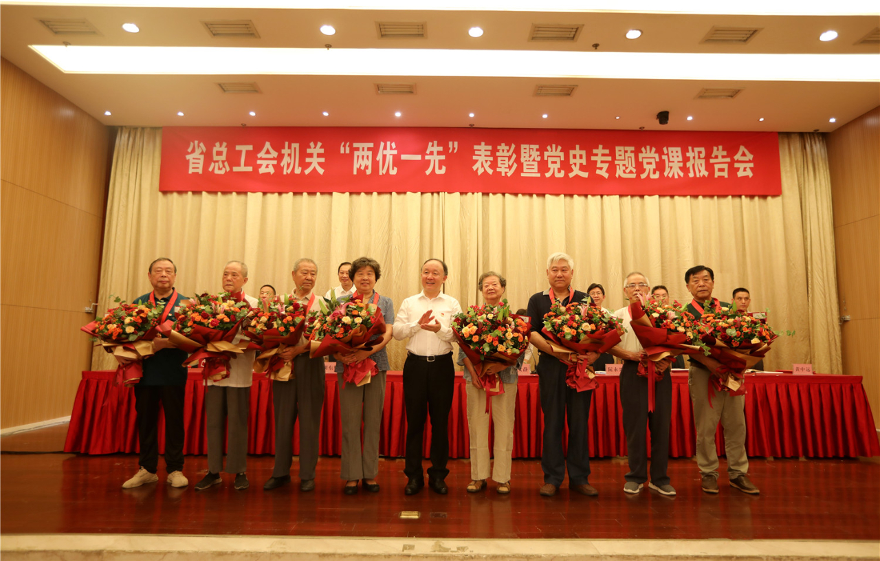 6月30日上午,安徽省总工会机关召开“两优一先”表彰暨党史专题党课报告会。安徽省总工会党组书记、副主席徐发成向8名老党员代表颁发“光荣在党50年”纪念章并作党史专题党课报告。安徽省总领导张文静、胡东辉、阮永兴、许建清、曾传发出席会议。