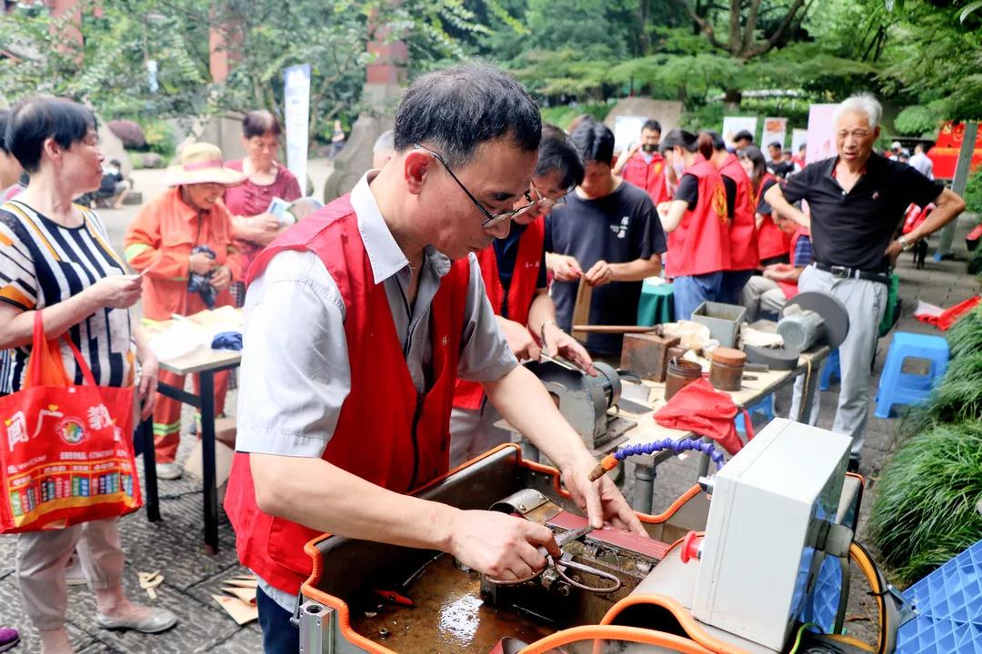 由“杭州工匠”陈标率领的服务队提供的剪刀刀具磨制服务同样排起了长龙。服务队员们架好机器立马就干,比原定活动开始时间提前了整整半小时,整个上午一刻也没得空闲。