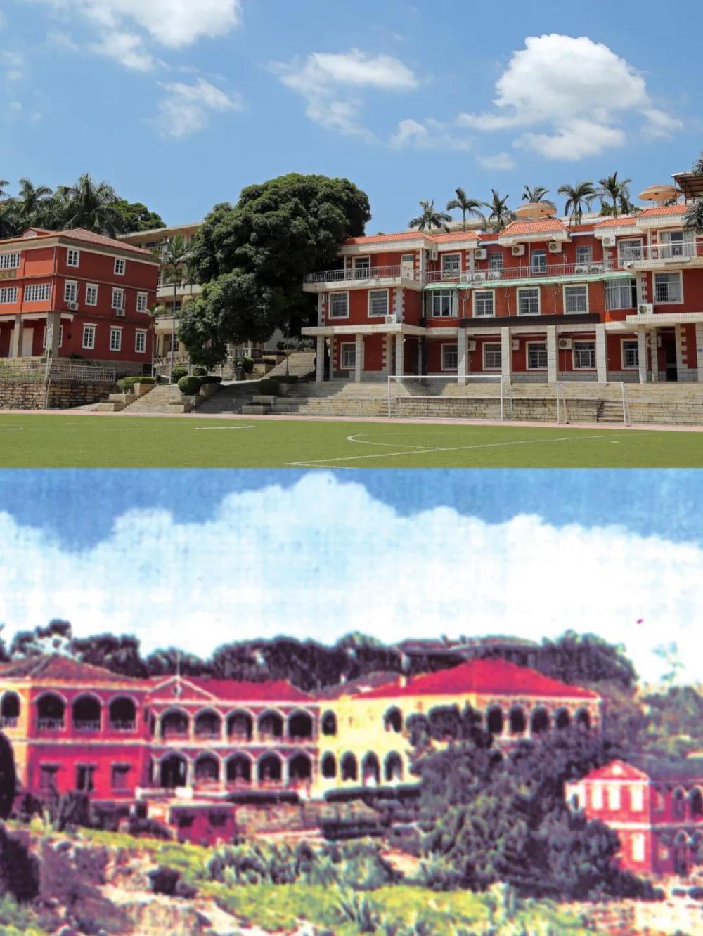 上图为厦门二中如今的校园,下图为英华中学老照片。受访者供图