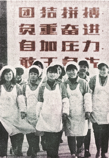 图②:上世纪90年代,工人们从写有“张家港精神”十六字内容的照壁前走过。