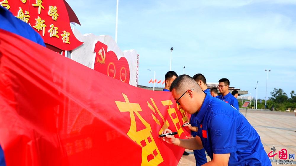 随后,大家在“奋斗百年路、启航新征程”的横幅上郑重地签下了自己的名字,也签下了他们誓要“在深海小岛上锻造出彩人生、在航天事业中绽放青春梦想”的郑重承诺。
