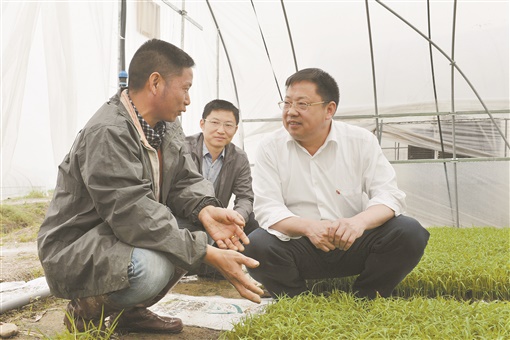 2013年5月,蒙汉(右一)在溆浦县桥江镇新坪村了解水稻集中育秧情况。 通讯员 摄