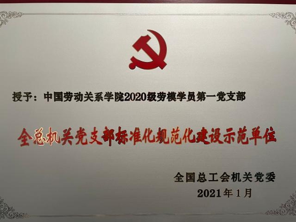 2020级劳模学员第一党支部喜获“全总机关党支部标准化规范化建设示范单位”荣誉称号