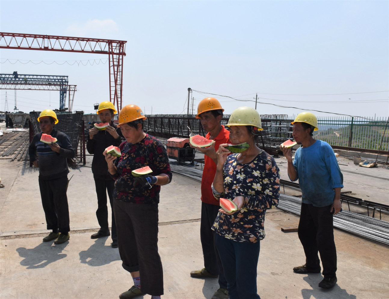 工人们吃上送到一线的清凉西瓜,好甜!