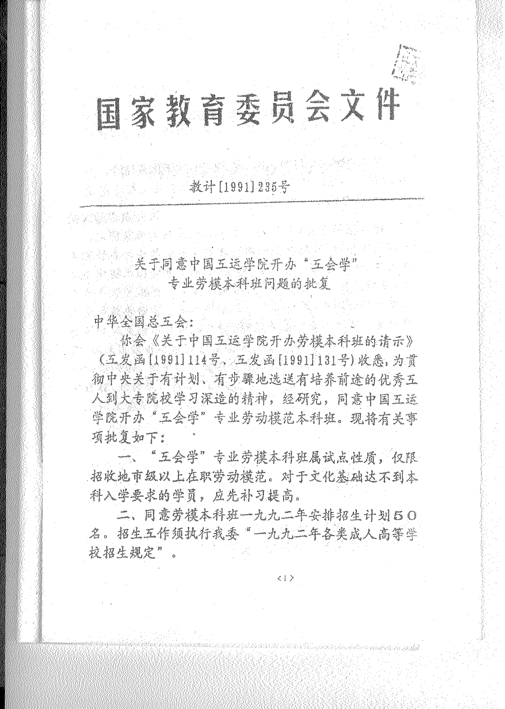 1991年国家教委关于同意中国工运学院开办劳模本科班问题的批复
