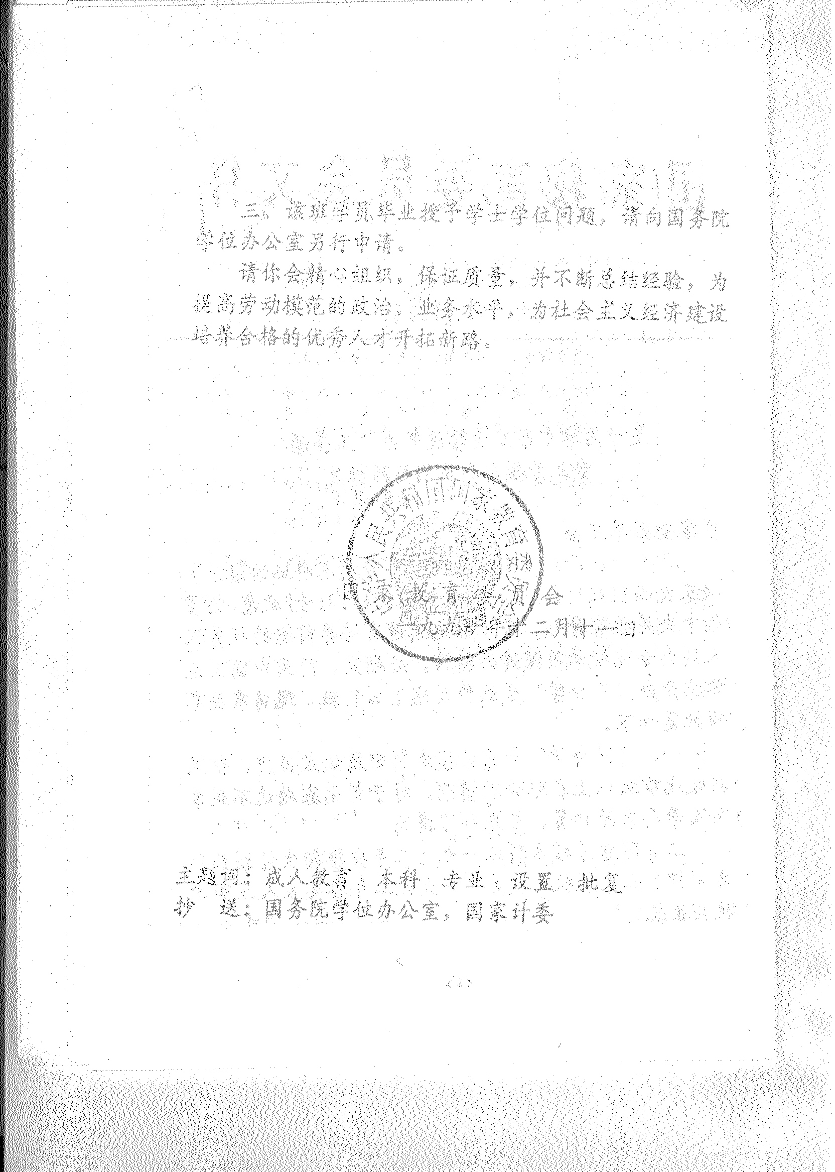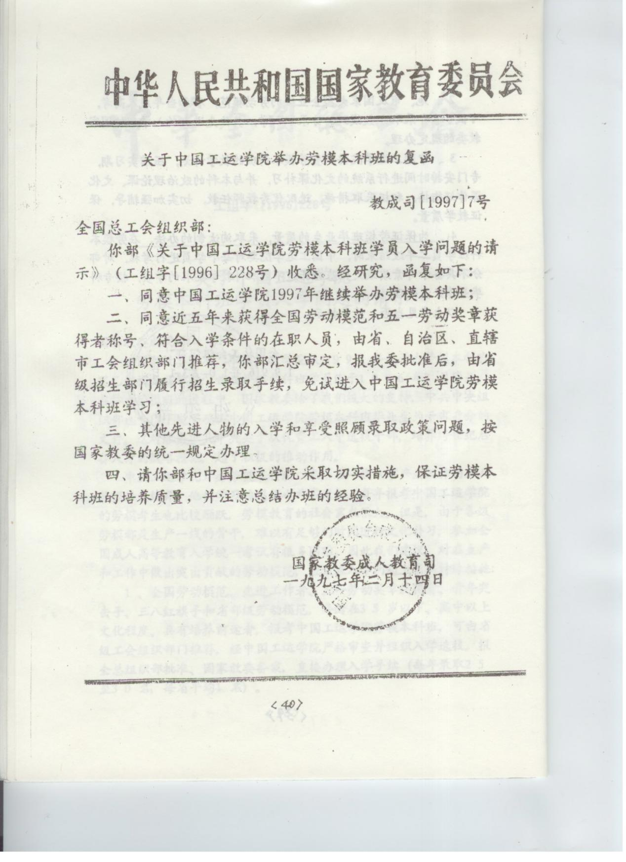 1997年国家教育委员会同意全国劳模和五一劳动奖章获得者免试进入中国工运学院劳模本科班学习的批复