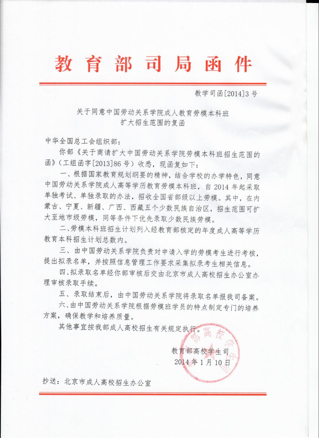 2014年教育部关于同意中国劳动关系学院成人教育劳模本科班扩大招生范围的复函
