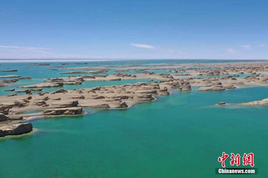 7月7日,航拍青海省海西州柴达木腹地的乌素特(水上)雅丹。乌素特(水上)雅丹群遍布于湖泊之中,微波潾潾的湖面映照着形象万千的雅丹倒印,美仑美奂。成群的水鸟和野鸭,或翱翔在湛蓝的天空中,或戏水在微光波映的湖水里,或在雅丹之上奔跑追逐,被游客们称作“百鸟千岛湖”。(无人机照片) 通讯员 廖华煜 摄