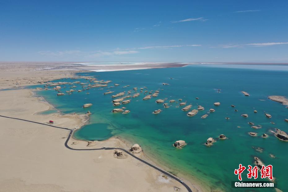 7月7日,航拍青海省海西州柴达木腹地的乌素特(水上)雅丹。乌素特(水上)雅丹群遍布于湖泊之中,微波潾潾的湖面映照着形象万千的雅丹倒印,美仑美奂。成群的水鸟和野鸭,或翱翔在湛蓝的天空中,或戏水在微光波映的湖水里,或在雅丹之上奔跑追逐,被游客们称作“百鸟千岛湖”。(无人机照片)通讯员 廖华煜 摄