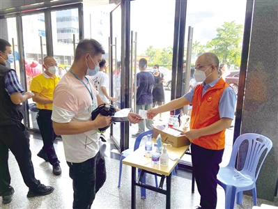 龚玉文(右)为员工发放防疫卡 受访者供图