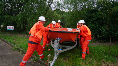 “一、二、三,抬。”7月7日,国家管网东部储运有限公司荆门处洪湖站员工喊着口号,将防汛冲锋舟拖拽至水中,准备试运。