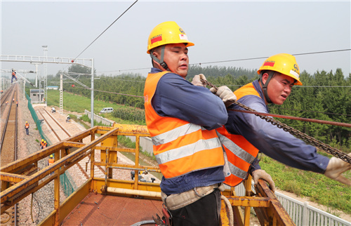 每年暑期,铁路人都面临着“高温烘烤”+“繁忙暑运”的组合考验。作为繁忙的京沪铁路线上的接触网工来说,更是如此。他们的工作是在毫无遮挡物的烈日下,默默坚守在动辄6米高的接触网上感受“最纯正的夏日体验”。图为中国中铁电气化局运管公司上海维管处徐州维管段接触网工的夏日作业现场。(廖娜 王伟)