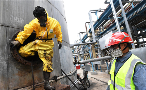 施工人员身着全封闭防护服、佩戴防毒面具,背着压缩空气小钢瓶、报警仪,携带探照灯进入TK-505罐内。罐内空间狭小,气温高,不一会就一身汗水。他们用木制防爆锹清淤、用塑料桶运出,防止产生静电火花规避安全风险。