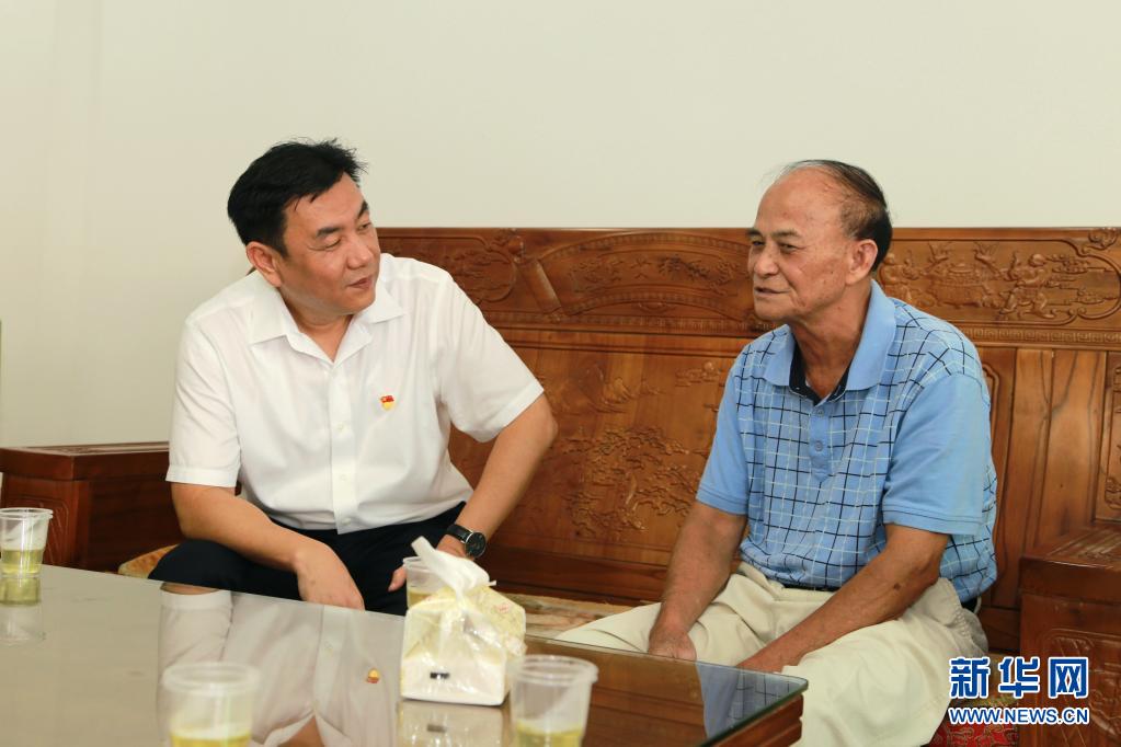 刘光滨(左)到基层慰问老党员(2019年6月28日摄)。新华社发