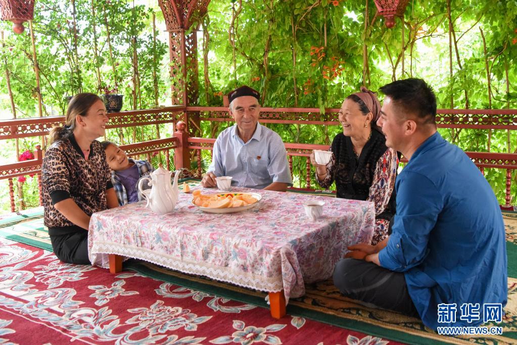 在新疆伊宁县温亚尔镇布力开村,买买提江·吾买尔(中)一家人在聊天(6月12日摄)。新华社记者 丁磊 摄