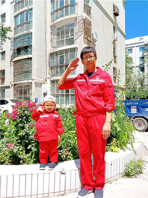 前不久,青工杨小腾和儿子杨曦泽身穿红色亲子工装庆祝建党百年华诞的照片,在中国石化和西北油田微博上卷起一阵工装热潮。