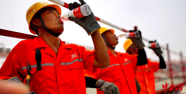 一线工人休息间隙,项目部为工人提供矿泉水。华军 摄