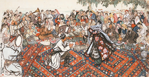 红色是中国人最喜爱的颜色,折射出中国人积极、热情的民族性格,故而成为中华民族的文化图腾和精神皈依。史前时代,源于对生命和鲜血的敬畏、对火和日神的虔诚膜拜,我国先民赋予“红”超人的神性与力量,红色因此被建构了吉祥如意的文化原型。贾浩义所作《人之初》,一轮火红的太阳与新生的小男孩,是其对生命起源最诗意的注释。黄胄的《丰乐图》描绘了新疆人民庆丰收的欢乐场景,洋溢着活泼祥和的生活气息。在古代,出于维护等级礼制的需要,中国传统阴阳五行学说奠定了“赤”的正色地位,统治者赋予红色以尊贵、道德的文化意涵。而在民间,从道教俗神钟馗的红色状元袍到襁褓婴儿的贴身肚兜、从深闺女儿的红头绳到婚嫁新人的红衣裳、从新春佳节悬挂的红灯笼到家家户户点燃的红爆竹等,无不彰显着中国人民对于热闹、平安与祥和的美好祈愿。