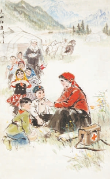 20世纪山水画名家李可染先生作《万山红遍》,点点朱砂倾注了画家对国家、时代最为炽热的情感,彰显了其“为祖国河山立传”的艺术信念。周思聪和耿玉琨合作绘制的《天山红医》,记录了青年女医者为牧民孩子看病的场景,诠释了其“艺术是人道主义的,是人性、人的感情的结晶”的使命与担当。卢沉笔下的《机车大夫》是20世纪60年代主题性人物画创作的精品,塑造了一批积极向上、乐观质朴的工人形象,展现了新中国工业建设蒸蒸日上的繁荣景象。